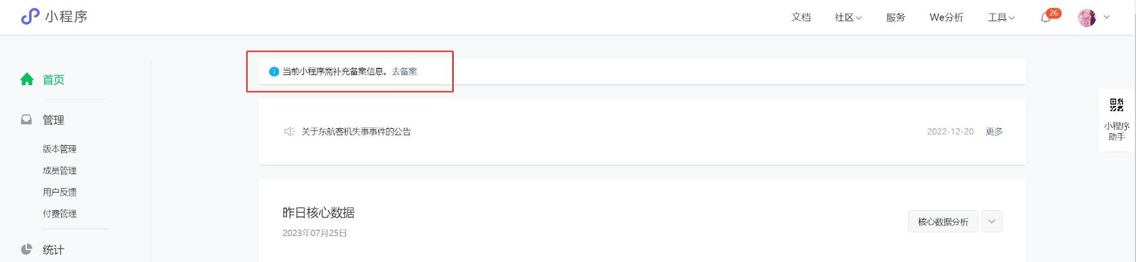 小程序管理后臺頂部會(huì )提示“小程序需補充備案信息”的提醒,點(diǎn)擊【去備案】即可進(jìn)入備案流程