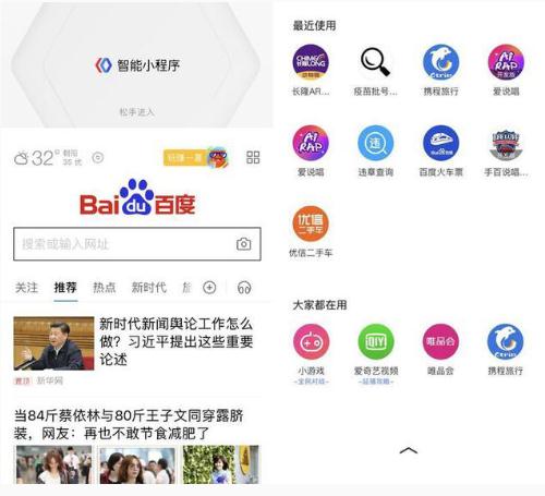 雖然百度版的智能小程序僅僅推出了兩月有余,百度小程序在更新迭代上,從未表現出絲毫的懈怠?,F在用戶(hù)可以直接從手機百度 APP 首頁(yè)下拉調取進(jìn)入小程序頁(yè)面,雖然與微信的首頁(yè)下拉采取了相同的調取方式,但是相較于微信的半屏展示,百度的全屏呈現顯然使得小程序的排布更加符合視覺(jué)習慣,更加便于用戶(hù)的查找與點(diǎn)擊。