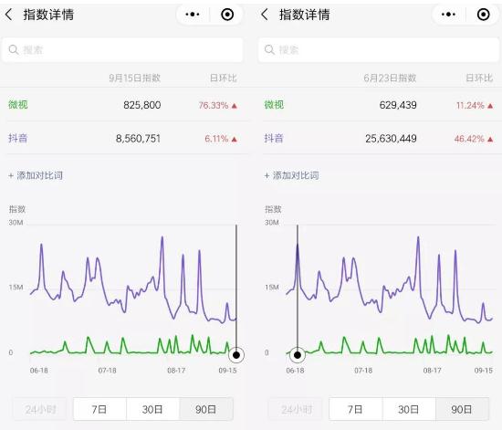 從微信指數對比圖里也可以看出,9月15日,抖音指數比微視指數高了 10 倍以上。6月23日,抖音比微視更是高了 40 倍。