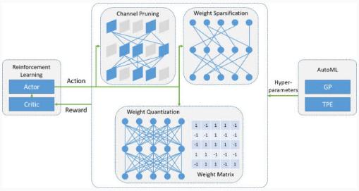 超參數優(yōu)化(hyper-parameter optimization)部分可以通過(guò)強化學(xué)習或者 AutoML,在整體壓縮率一定的情況下,搜索出每一層最合適的壓縮比例使得整體的精度最高。多數開(kāi)發(fā)者對模型壓縮算法往往了解較少,調節壓縮算法參數需要長(cháng)期的學(xué)習和實(shí)驗才能有所經(jīng)驗, 但超參數取值對最終結果往往有著(zhù)巨大的影。PocketFlow 的超參數優(yōu)化部分正是幫助開(kāi)發(fā)者解決了這一大痛點(diǎn),并且通過(guò)實(shí)驗我們發(fā)現,其優(yōu)化結果也要好于專(zhuān)業(yè)的模型壓縮工程師手工調參的結果。其結構如下圖: