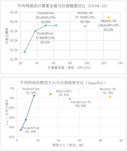 在 CIFAR-10 數據集上,PocketFlow 以 ResNet-56 作為基準模型進(jìn)行通道剪枝,并加入了超參數優(yōu)化和網(wǎng)絡(luò )蒸餾等訓練策略,實(shí)現了 2.5 倍加速下分類(lèi)精度損失 0.4%,3.3 倍加速下精度損失 0.7%,且顯著(zhù)優(yōu)于未壓縮的 ResNet-44 模型; 在 ImageNet 數據集上,PocketFlow 可以對原本已經(jīng)十分精簡(jiǎn)的 MobileNet 模型繼續進(jìn)行權重稀疏化,以更小的模型尺寸取得相似的分類(lèi)精度;與 Inception-V1、ResNet-18 等模型相比,模型大小僅為后者的約 20~40%,但分類(lèi)精度基本一致(甚至更高)。