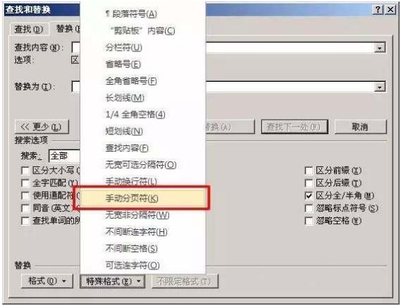 使用Word快捷鍵“Ctrl + H”打開(kāi)查找替換窗口,然后單擊“高級”或“更多”在“特殊格式”中選擇“手動(dòng)分頁(yè)符”