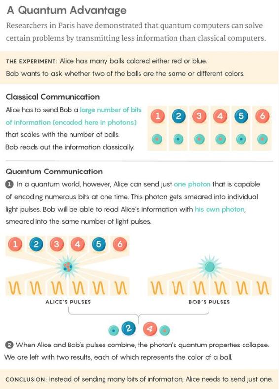 伊萊妮·迪亞曼蒂、洛達尼斯·凱瑞尼迪斯與尼拉杰·庫馬爾打造了一套量子通訊系統,該系統相對經(jīng)典通訊系統的優(yōu)勢可以得到證明。