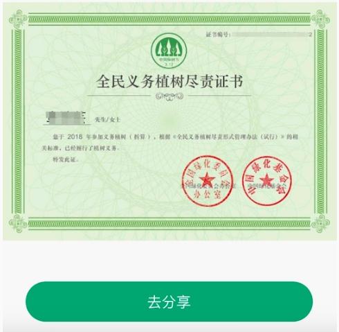 據了解,《全民義務(wù)植樹(shù)盡責證書(shū)》是國家為提高公民參與義務(wù)植樹(shù)的獲得感、榮譽(yù)感,借鑒無(wú)償獻血證等方面的管理思路,結合互聯(lián)網(wǎng)技術(shù),擬對完成當年植樹(shù)義務(wù)的公民,通過(guò)全民義務(wù)植樹(shù)網(wǎng)頒發(fā)盡責電子證書(shū),每份證書(shū)具有唯一的編號和二維碼。