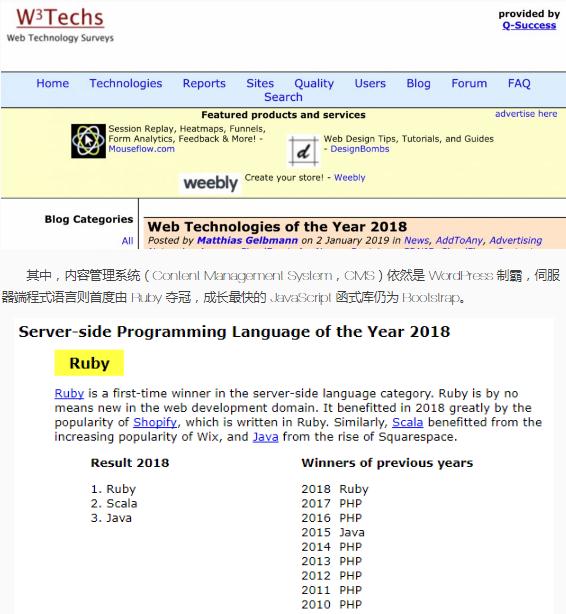2018 年服務(wù)器端程序語(yǔ)言成長(cháng)第一的語(yǔ)言從 PHP 換成 Ruby,W3techs 解釋是因為由 Ruby 開(kāi)發(fā)的 Shopify 在 2018 年大幅普及。網(wǎng)路技術(shù)調查機構 W3Techs 公布 2018 年度網(wǎng)站技術(shù),他們將 2018 年 1 月 1 日網(wǎng)站使用技術(shù)的統計資料,與 2019 年 1 月 1 日的數字相比,排名一整年技術(shù)成長(cháng)速度。