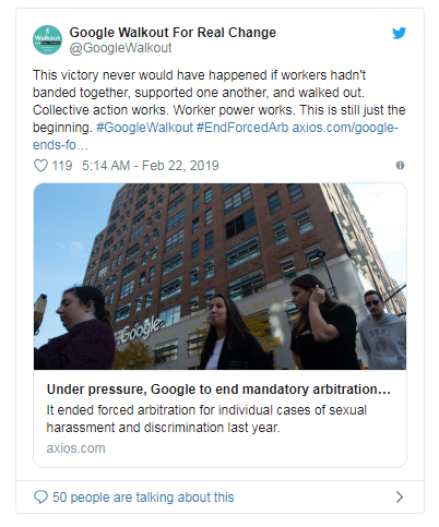 強制性仲裁協(xié)議要求員工在內部投訴期間放棄在法庭上提出法律訴訟的權利。谷歌員工就這一問(wèn)題多次組織抗議活動(dòng),并敦促高管完全結束這種做法。