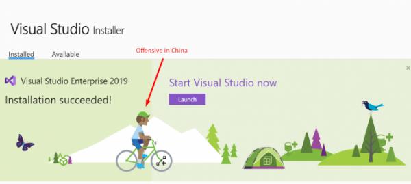 在 Visual Studio 編譯器開(kāi)發(fā)者社區,一位華人遞交了 bug 報告,原因是 VS 安裝程序的背景圖里有位騎著(zhù)自行車(chē)的人,而這個(gè)人戴著(zhù)一個(gè)綠帽子。這位 bug 遞交者聲稱(chēng)綠帽子在中國文化里是貶義詞,意思是女友或妻子出軌。