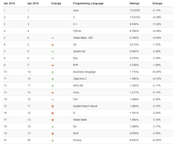 TIOBE 公布了 2019 年 4 月編程語(yǔ)言排行榜,總體排名變化不大,排名前十的分別是:Java, C, C++, Python, Visual Basic .NET, C#, JavaScript, SQL, PHP 和匯編語(yǔ)言。