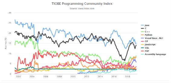 TOP 10 編程語(yǔ)言 TIOBE 指數走勢(2002-2018)