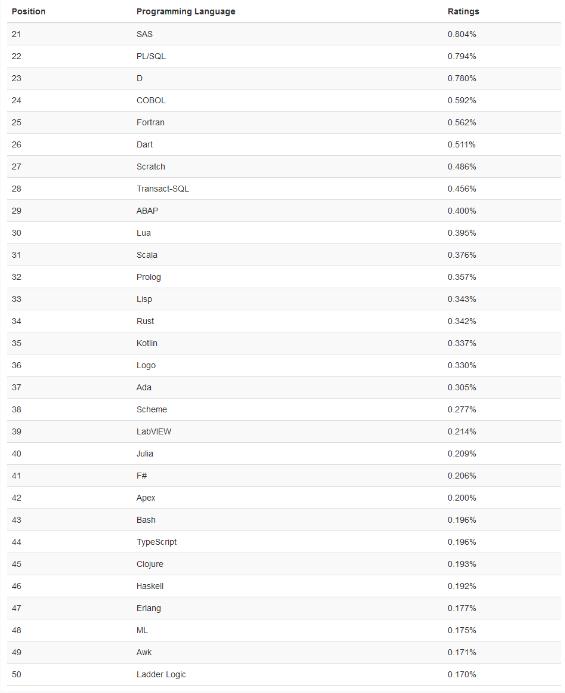 21-50 名的編程語(yǔ)言排行