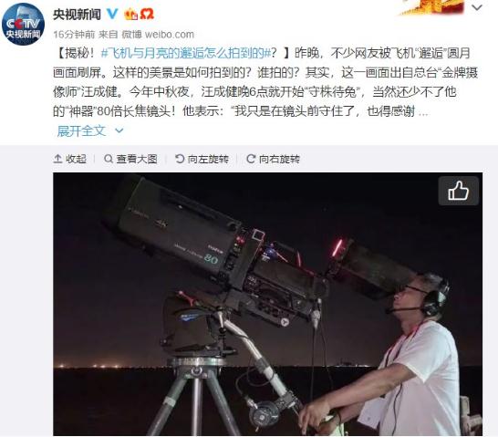 在今年的中秋夜,央視直播團隊用 80 倍長(cháng)焦鏡頭意外記錄下了“飛機穿月”這神奇的一幕?,F在,央視官方進(jìn)行了揭秘,該作品是央視總臺“金牌攝像師”汪成健用“神器”80 倍長(cháng)焦鏡頭拍攝的杰作。