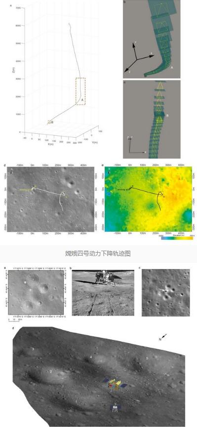 嫦娥四號降落相機拍攝的影像圖會(huì )在著(zhù)陸后通過(guò)“鵲橋”中繼衛星傳回地球。利用這些圖像對嫦娥四號著(zhù)陸軌跡進(jìn)行重構,文章在三維空間中繪制了探測器的下降軌跡,位置精度可以達到 1m 左右。根據解算的 cm 分辨率地形數據,作者指出嫦娥四號著(zhù)陸在一個(gè)退化撞擊坑的緩坡上,距離北邊一個(gè)直徑 25 米的撞擊坑邊緣僅有 8.35m,且著(zhù)陸點(diǎn)周?chē)灿形鍌€(gè)撞擊坑。隨后,作者結合導航相機拍攝的圖像,精確計算出嫦娥四號的著(zhù)陸點(diǎn)為東經(jīng) 177.5991°,南緯 45.4446°,高程-5935 米,并在空間分辨率 7m、5m、1m、10cm 和 5cm 的月球影像和地形數據上進(jìn)行了精確識別。