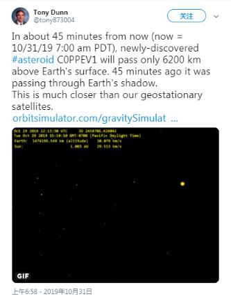 根據這些早期觀(guān)測的數據,小行星比 NASA 已知近地天體數據庫中的任何其他已知近地天體更靠近我們的行星表面(實(shí)際上并未與我們的大氣發(fā)生碰撞)。模擬顯示,小行星在太平洋時(shí)間上午7:45 左右最接近地球,距離約為 3852 英里(6200 公里),從非洲南部上方通過(guò)。