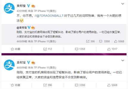對此,支付寶回應稱(chēng):“剛剛,支付寶的機房網(wǎng)絡(luò )出現了短暫抖動(dòng),影響了部分用戶(hù)的使用體驗。一切已經(jīng)恢復正常,大家的資金和信息安全不會(huì )受到影響哈。”