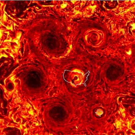 在上圖中,新的氣旋風(fēng)暴在右下角顯示為亮黃色的球體,成為圍繞中心點(diǎn)形成的第六個(gè)氣旋風(fēng)暴。從規模上看,新的氣旋風(fēng)暴與德克薩斯州差不多大小。