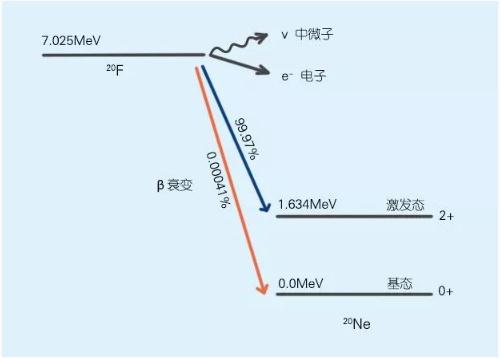 研究人員測量了那些能量超過(guò) 5.8MeV 的電子。這些電子只能通過(guò)²?F到²?Ne??的禁戒躍遷產(chǎn)生。當²?F衰變成²?Ne²?時(shí),衰變釋放的 1.634MeV 能量(即衰變能量)會(huì )被隨后由激發(fā) Ne 所發(fā)射的光子帶走。但當²?F衰變成²時(shí),全部的衰變能量(7.024MeV)會(huì )轉給電子和反中微子。由于這種差異,由禁戒躍遷發(fā)射的電子比由更常見(jiàn)躍遷發(fā)射電子攜帶更多的能量。通過(guò)仔細計算每一種能量的電子數,研究小組確定了²?F衰變至²?Ne??的幾率為 0.00041%(大約 25 萬(wàn)分之一)。這聽(tīng)起來(lái)很小,但這一比例足以使它成為任何原子核中測量到的第二強的禁戒躍遷。