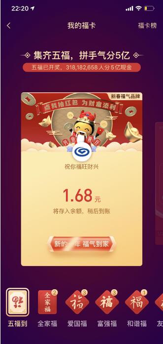 1月24日晚間消息,除夕之夜一年一度的支付寶集五?;顒?dòng)今晚22:18分準時(shí)開(kāi)獎。