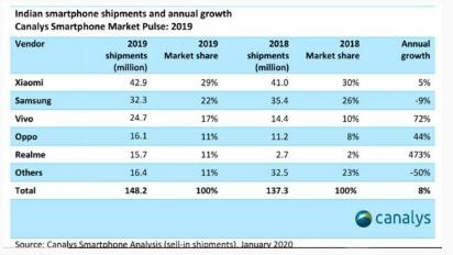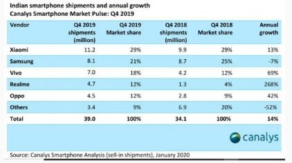 市場(chǎng)調研機構Canalys日前發(fā)布印度手機市場(chǎng)報告,報告顯示,2019年第四季度印度智能手機市場(chǎng)增長(cháng)14%,總出貨量為3,900萬(wàn)臺。印度智能手機全年出貨量增長(cháng)8%,達到1.48億部。其中小米市場(chǎng)占有率達到29%,出貨量1120萬(wàn)臺,增長(cháng)13%。同時(shí)小米連續10個(gè)季度雄踞印度市場(chǎng)榜首。全年出貨量達到4290萬(wàn)部。