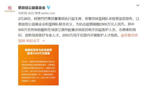 2 月 26 日消息,阿里巴巴集團董事局執行副主席、布魯克林籃網(wǎng)隊老板蔡崇信宣布,將以蔡崇信公益基金會(huì )和籃網(wǎng)隊聯(lián)合名義,捐贈 2500 萬(wàn)元人民幣,重點(diǎn)對醫護人員和機構提供支持。
