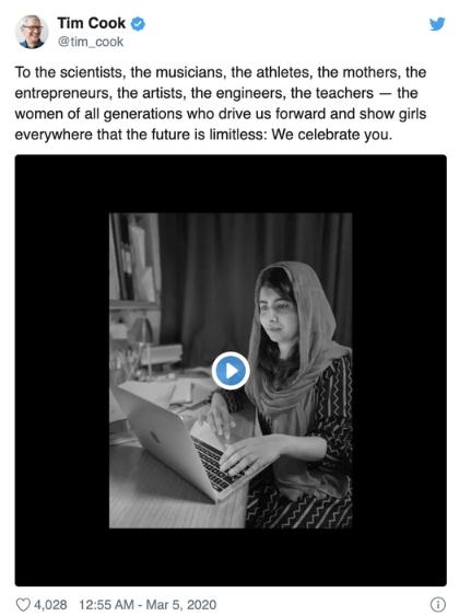 庫克的 Twitter 消息中包括了一段 40 秒長(cháng)的視頻,其中包含了碧昂絲的歌曲《Flawless》,以及使用 MacBook 的女性形象。視頻中出現的其他女性還包括歌手 Lady Gaga、南非由女性運營(yíng)的反偷獵組織“黑曼巴”,以及巴基斯坦的社會(huì )活動(dòng)家馬拉拉·尤薩福扎伊(Malala Yousafzai)。
