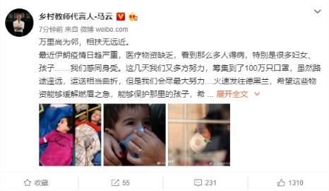 馬云表示,最近伊朗疫情日趨嚴重,醫療物資缺乏,看到那么多人得病,特別是很多婦女、孩子……我們感同身受。這幾天我們又多方努力,籌集到了 100 萬(wàn)只口罩。