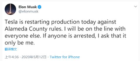 而特斯拉首席執行官埃隆·馬斯克(Elon Musk)證實(shí),自己違反了當地的就地避難命令,決定重新開(kāi)放公司位于加州弗里蒙特的汽車(chē)制造工廠(chǎng)。馬斯克表示本周自己將在公司的生產(chǎn)線(xiàn)上工作。馬斯克寫(xiě)道:“如果有人被逮捕,我要求只逮捕我一個(gè)人。”