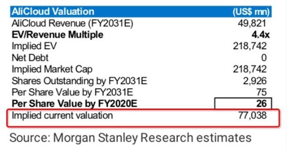 在最新評估中,摩根士丹利將阿里云估值上調至 770 億美元,約合 5400 億元。這一估值超過(guò)百度的 2 倍,在中國上市的互聯(lián)網(wǎng)公司中排名第四。分析師認為,云計算行業(yè)贏(yíng)者通吃(Winner Takes All),阿里云占據亞太和中國市場(chǎng)絕對領(lǐng)先地位,市場(chǎng)潛力巨大。