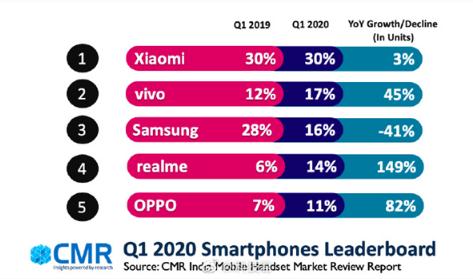 5 月 31 日,據媒體報道,CMR 發(fā)布 2020 年 Q1 印度智能手機品牌出貨量 TOP5,小米、vivo、realme、OPPO 榜上有名,三星屈居第三。
