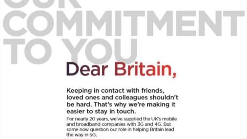 華為在《我們對你們的承諾》廣告中稱(chēng):“近 20 年來(lái),我們?yōu)橛囊苿?dòng)和寬帶公司提供了 3G、4G 網(wǎng)絡(luò ),但是一些人現在質(zhì)疑我們在幫助英國引領(lǐng) 5G 部署方面所扮演的角色。華為將繼續一如既往地為你們的網(wǎng)絡(luò )運營(yíng)商提供最好的設備,這樣你們就可以分享照片、觀(guān)看流媒體電影。”