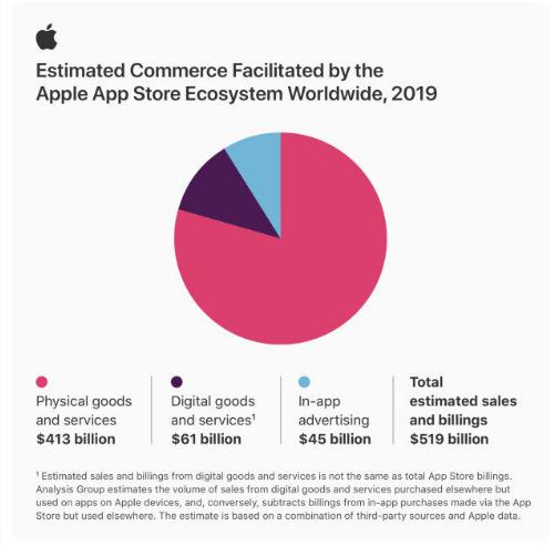 根據蘋(píng)果公布的數據,在 2019 年 App Store 生態(tài)系統在全球促成 5190 億美元的款項和銷(xiāo)售額,根據 Analysis Group 的數據表明,這些銷(xiāo)售包括了 175 個(gè)國家和地區。