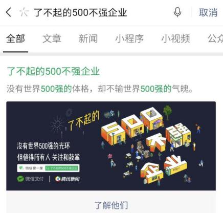 同時(shí),在微信搜一搜活動(dòng)專(zhuān)區,用戶(hù)通過(guò)搜索關(guān)鍵詞“了不起的 500 不強企業(yè)”,即可進(jìn)入專(zhuān)區了解更多關(guān)于中小商家疫后重啟的相關(guān)報道。