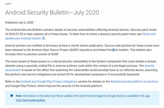 今天谷歌發(fā)布了新的安全公告,Android 系統迎來(lái) 2020-07-01 和 2020-07-05 兩個(gè)安全補丁,都是解決棘手的安全漏洞。