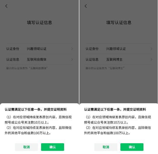 興趣領(lǐng)域認證,對粉絲數要求比較高,微信以外的平臺基本上是要求粉絲數超過(guò)100萬(wàn),比如微博,抖音,快手等。微信公眾號粉絲超過(guò)10萬(wàn),視頻號粉絲超過(guò)10萬(wàn),只要滿(mǎn)足其中任何一條都可以認證。認證次數也是每年2次