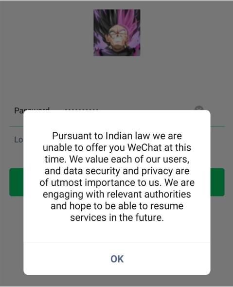 “依據印度法律,我們目前無(wú)法向您提供微信服務(wù)。我們尊重每一位用戶(hù),數據安全和隱私對我們而言是最重要的。我們正在與有關(guān)部門(mén)積極協(xié)調,希望能在未來(lái)恢復服務(wù)。”
