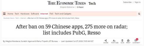 7 月 27 日,據印度《經(jīng)濟日報》報道,它們得到的消息顯示,印度繼此前宣布推出針對中國 59 款 App 的禁令后,再次推出新計劃,將審核 275 款中國開(kāi)發(fā)商的 App,該消息一出,令不少網(wǎng)友嘩然。目前,雖不知道印度是否會(huì )對這些 App 推出同樣的禁令,但是參照此前的情況,這批 App 中可能會(huì )有一部分面臨同樣的結果。