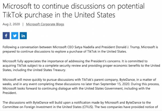 微軟稱(chēng),公司將快速行動(dòng),在幾周內推進(jìn)與 Tik Tok 母公司字節跳動(dòng)的討論,無(wú)論如何也要在不遲于 2020 年 9 月 15 日時(shí)間內完成討論。在這一過(guò)程中,微軟期待繼續與美國政府對話(huà),包括總統特朗普。