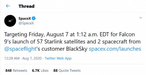 這次星鏈計劃的發(fā)射行動(dòng)預計將于美國東部時(shí)間 8 月 7 日星期五上午1:12(太平洋時(shí)區 8 月 6 日晚上 10:12) 在佛羅里達州肯尼迪航天中心實(shí)施。另外,行動(dòng)還在 8 月 8 日星期六美國東部時(shí)間上午 12:50(美國東部時(shí)間 8 月 7 日晚間9:50) 設置了一個(gè)備選發(fā)射時(shí)間點(diǎn)。