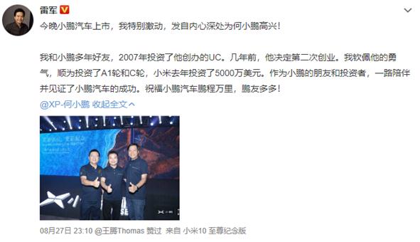 “作為小鵬的朋友和投資者,一路陪伴并見(jiàn)證了小鵬汽車(chē)的成功。祝福小鵬汽車(chē)鵬程萬(wàn)里,鵬友多多!”雷軍說(shuō)道。