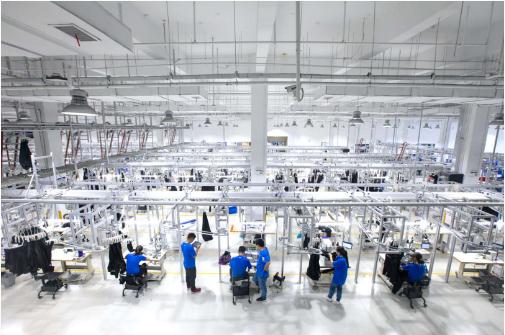 在生產(chǎn)車(chē)間的上方有一排排的吊掛,這是犀牛智造首創(chuàng )的“棋盤(pán)式吊掛”,可以通過(guò)物聯(lián)網(wǎng)+人工智能技術(shù),將吊掛衣架自動(dòng)分配至相對空閑的工位,改變了過(guò)去服裝工廠(chǎng)吊掛單向流轉,容易擁堵的問(wèn)題。