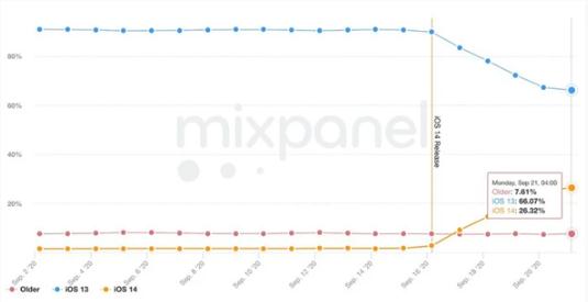 根據移動(dòng)分析公司 Mixpanel 的數據,iOS 14 正式版推出 5 天時(shí)間內,更新的采用率已經(jīng)達到約 26% 的活躍 iPhone、iPad 和 iPod touch 設備,數據中包括 iPadOS 14。