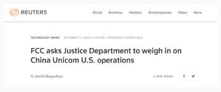 為此,FCC 在信中要求各機構于當地時(shí)間 11 月 16 日前作出回應。而目前,中國聯(lián)通美洲公司暫未作出回應。