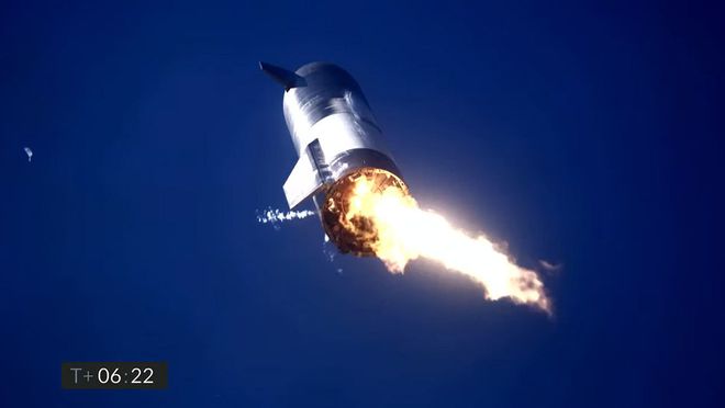 SN9 的發(fā)射進(jìn)行得很順利。隨著(zhù)高度爬升,兩個(gè)發(fā)動(dòng)機先后按計劃關(guān)閉。最后,在發(fā)射大約四分半鐘后達到最大高度時(shí),第三個(gè)發(fā)動(dòng)機關(guān)閉,星際飛船開(kāi)始側翻,在長(cháng)時(shí)間俯沖返回地球的過(guò)程中,機頭和尾部使用鰭翼來(lái)幫助調整和保持方向。