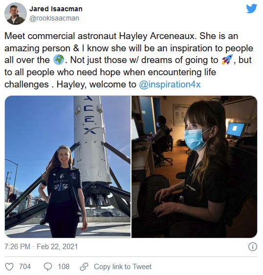 SpaceX 公司現在正在從事載人飛往太空的業(yè)務(wù),如果一切都按計劃進(jìn)行,它將在今年晚些時(shí)候率先為完全由私人太空游客組成的乘員提供一次太空旅行的機會(huì )?,F在,我們知道誰(shuí)將加入億萬(wàn)富翁、Shift4Payments 創(chuàng )始人 Jason Isaacman 曼的那趟旅行 - 圣裘德兒童研究醫院的員工,也是前病人 Hayley Arceneaux。