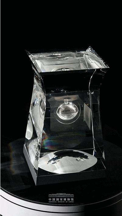下部地球造型磨砂透光,其上中國地圖造型透光突出,象征華夏大地對月亮的長(cháng)久情意。特別是容器內設計了地球與月球間相隔 9.9cm,取意古人所描繪的“天有九霄”,寓意中國探月突破極限、跨越“九重”,珍貴的月壤與精心設計的容器相得益彰。