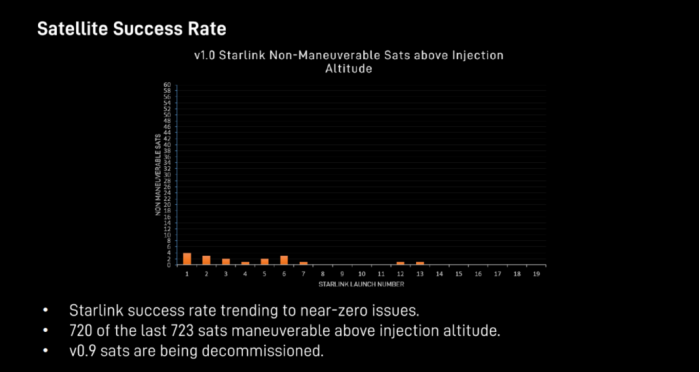 在安全方面,SpaceX 已經(jīng)進(jìn)行了兩項糾正性修改,以改善衛星的非機動(dòng)性。其中第一項是改進(jìn)其制造工藝,以便更好地進(jìn)行衛星測試。第二個(gè)是軟件更新,旨在根除導致航天器停止響應的問(wèn)題。根據 Goldman 的說(shuō)法,這些變化已經(jīng)開(kāi)始取得成效,因為在 SpaceX 公司發(fā)射的最后 723 顆衛星中,有 720 顆衛星的機動(dòng)性超過(guò)了注入高度。相對于直接將衛星發(fā)射到其軌道高度,SpaceX 首先將衛星送至較低的注入高度,之后測試其可操作性和反應,然后將衛星升至其軌道目的地。