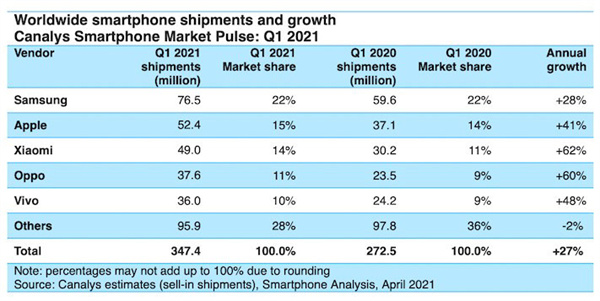 IT之家了解到,上述數據來(lái)自調研機構 Canalys,該機構的數據還顯示,2021 年第一季度全球智能手機出貨量呈上升趨勢,2021 年第一季度,全球智能手機出貨量達到 3.47 億部,同比增長(cháng) 27%。