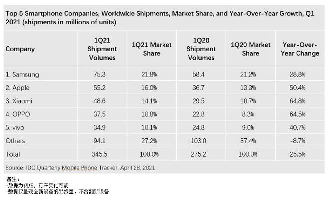 與此同時(shí),IDC和Canalys等第三方機構也發(fā)布了2021年第一季度數據。數據顯示,2021年第一季度華為跌出了全球排名前五的位置,前五名分別是三星、蘋(píng)果、小米、OPPO和vivo。