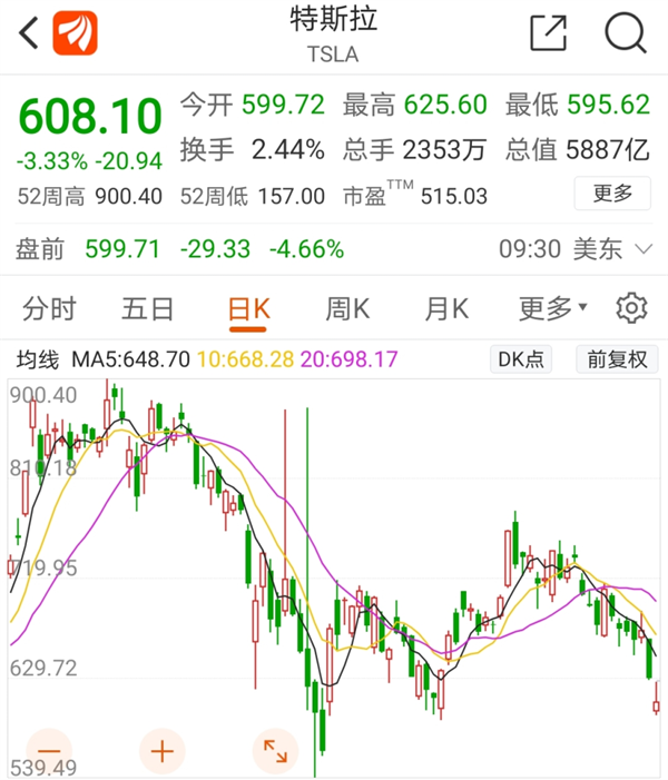 近期,特斯拉股價(jià)持續暴跌,較歷史最高位股價(jià)已經(jīng)跌去超過(guò)30%,11日盤(pán)前最大跌幅超過(guò)8%。美股開(kāi)盤(pán)后,特斯拉股價(jià)一度下挫逾5%,截至23:00點(diǎn),跌幅有所收窄,跌超3%。