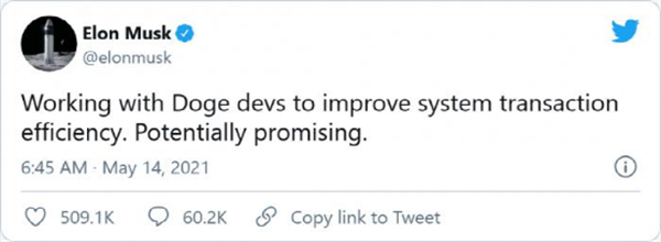 宣布特斯拉暫停比特幣支付后不久,馬斯克稱(chēng)正在與狗狗幣開(kāi)發(fā)人員合作以“提高系統交易效率”,并很有希望。