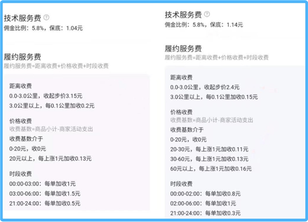 不難看出,新規實(shí)行了較低的技術(shù)服務(wù)費抽傭比例,一旦商家采用自配送方式,僅需向平臺支付技術(shù)服務(wù)費,保底費用1元多,較此前明顯降低;但選擇平臺配送的商家,則需在技術(shù)服務(wù)費的基礎上,再遵循履約服務(wù)費規則,后者對于3公里以外、深夜時(shí)段等特殊訂單,收取費用會(huì )有所增加。
